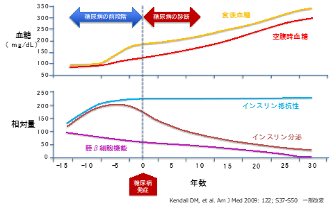 下に2型糖尿病の発症・経過のグラフを示しています。