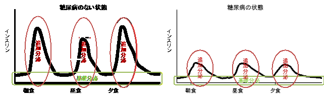 初期の段階では食事の際の追加分泌が低下し、糖尿病の進行に伴い1日を通して分泌されている基礎分泌も低下してきます。